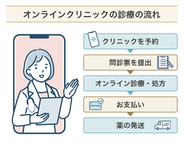 まず、オンライン診療を行っているクリニックを予約し、オンラインで診療を受けます。