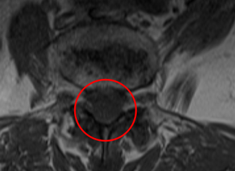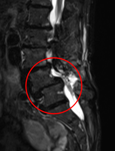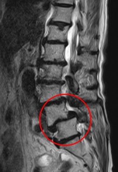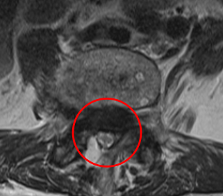 腰椎MRIの画像を確認したところ、L5とL4の腰椎がずれてしまっており、L4/5の脊柱管が圧迫されていました。そのため、痛みと痺れの原因は、すべり症に伴う脊柱管狭窄症と診断しました。