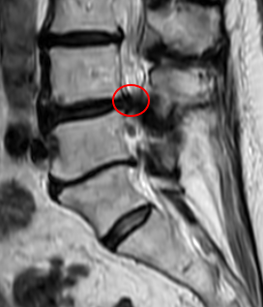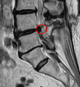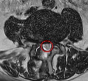 腰椎MRIの画像を確認したところ、赤い枠内のL4/5で脊柱管が狭窄しているのを確認しました。また「歩いて5分程度でより痛くなる」というお話しから間欠性跛行の症状が出ていると考えられます。