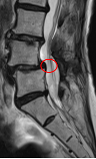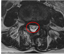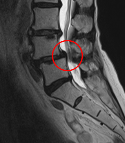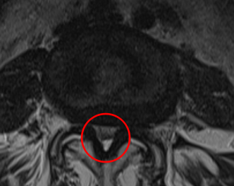 MRI画像を確認したところ、赤い枠で囲った箇所(L4/5)に脊柱管狭窄症の症状が認められ、かなり強く狭窄してしまっていました。腰痛や、左下肢の痛み、痺れの原因はこの狭窄だと判断しました。