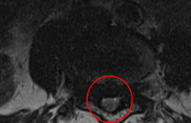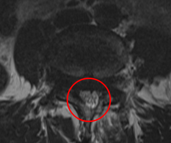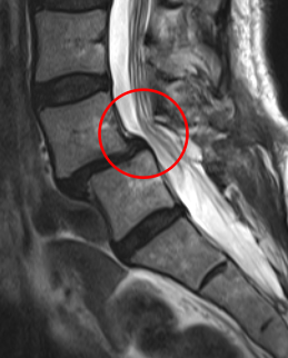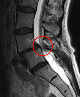 腰椎MRIを確認したところ、赤い枠で示されているL4/5 腰部脊柱管狭窄症、すべり症が見られました。特にL4/5脊柱管狭窄症に強く狭窄を認めました。
