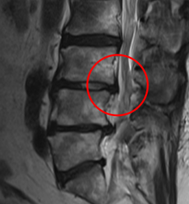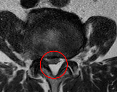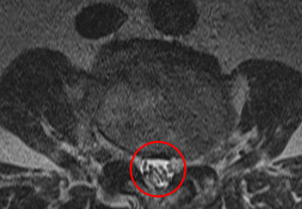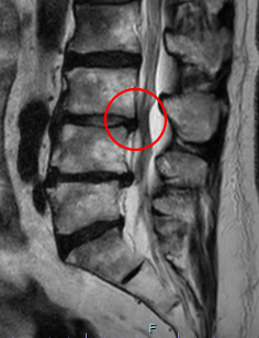 腰椎MRIを確認したところ、赤い枠内のL3/4で脊柱管が狭窄しているのを確認しました。そのため痛みの原因はL3/4部分の「脊柱管狭窄症」だと診断しました。