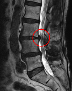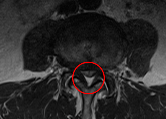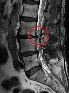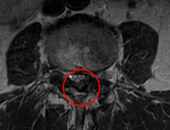 前回の治療時に発見していたL3/4の脊柱管狭窄症が悪化した可能性があると考え、再度、腰椎MRIで画像検査を実施しました。すると、元々、黄色靭帯が肥厚して狭窄を起こしていたL3/4で、それとは別に椎間板ヘルニアが進行しており、以前よりも狭窄が強くなっていることを確認しました。